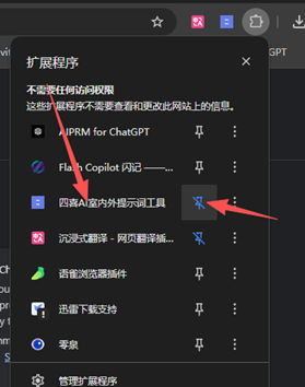 - 打开谷歌浏览器或Microsoft Edge浏览器 找到设置→拓展程序→管理拓展程序→加载未打包的扩展程序→选择解压后SixiAI-Prompt-Tool目录 找到四喜AI室内外提示词工具 选择置顶
