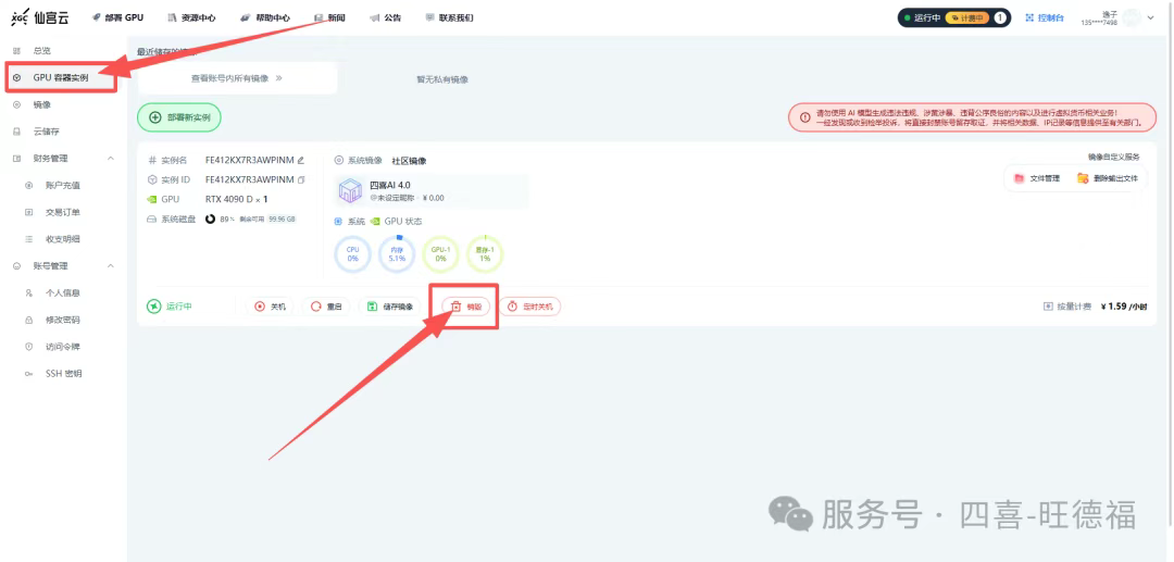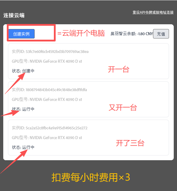 - 使用人数较多时,可能出现“gpu不足”字体,一直狂点创建实例,直到出现一个实例即可(注意是一个!!)