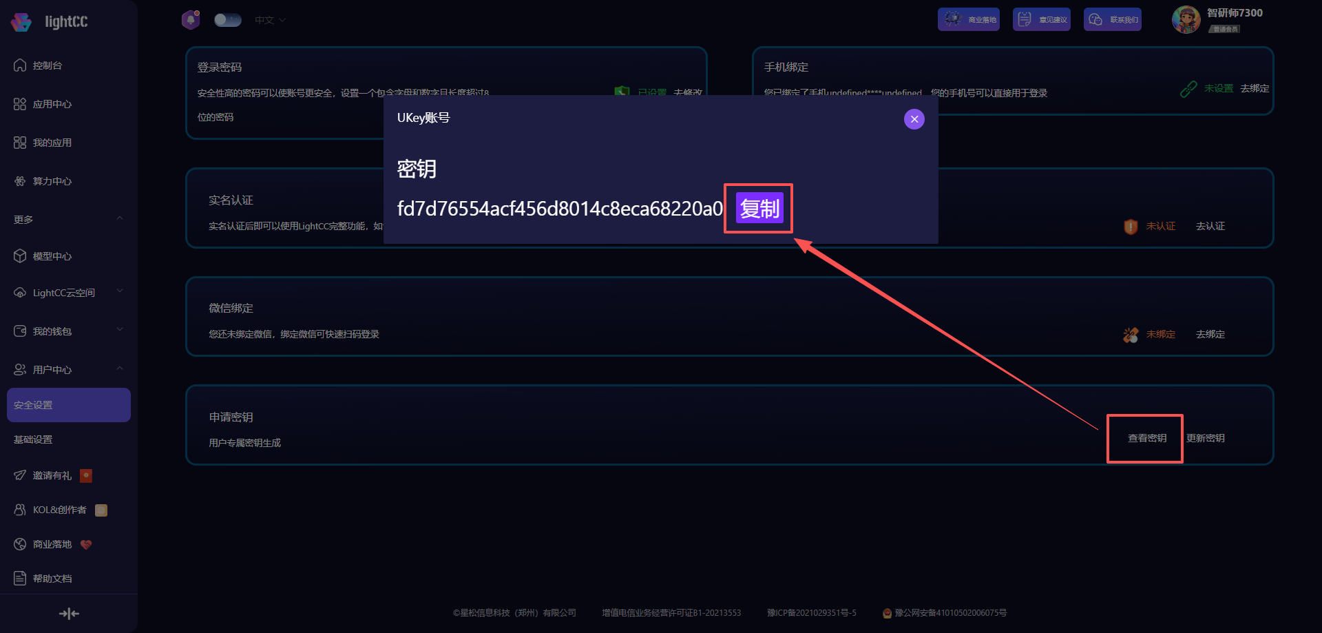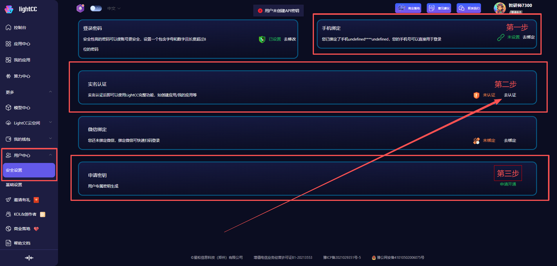 2.点击用户中心-安全设置,进行手机绑定-实名认证-申请密钥三个步骤