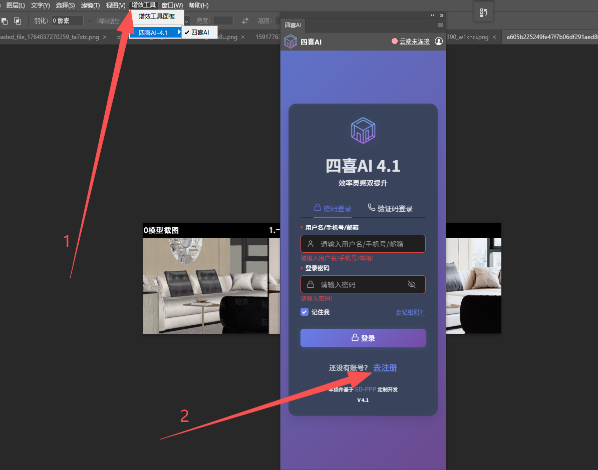 - 解压完成后,打开PS,找到增效工具,打开四喜ai,点击注册账号 点击可跳转注册